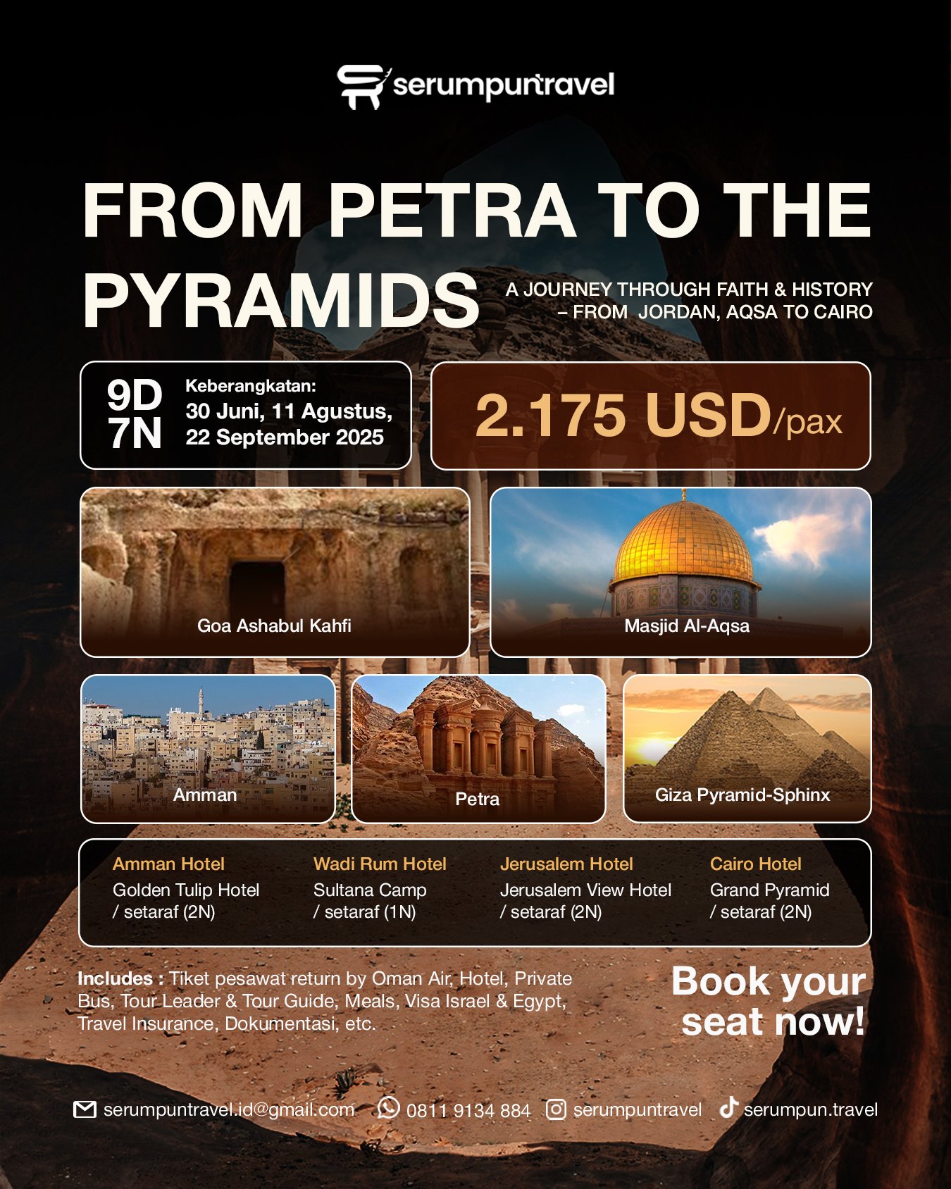 Yuk ikut Halal Trip bareng Serumpun Travel! Menjelajahi jejak Rasul dalam 9 hari dari mengunjungi Gua Ashabul Kahfi, Masjid Al-Aqsa, Amman, Petra, serta Giza Pyramid-Sphinx. Cocok untuk kamu yang ingin memiliki pengalaman anti-mainstream dan tak terlupakan.