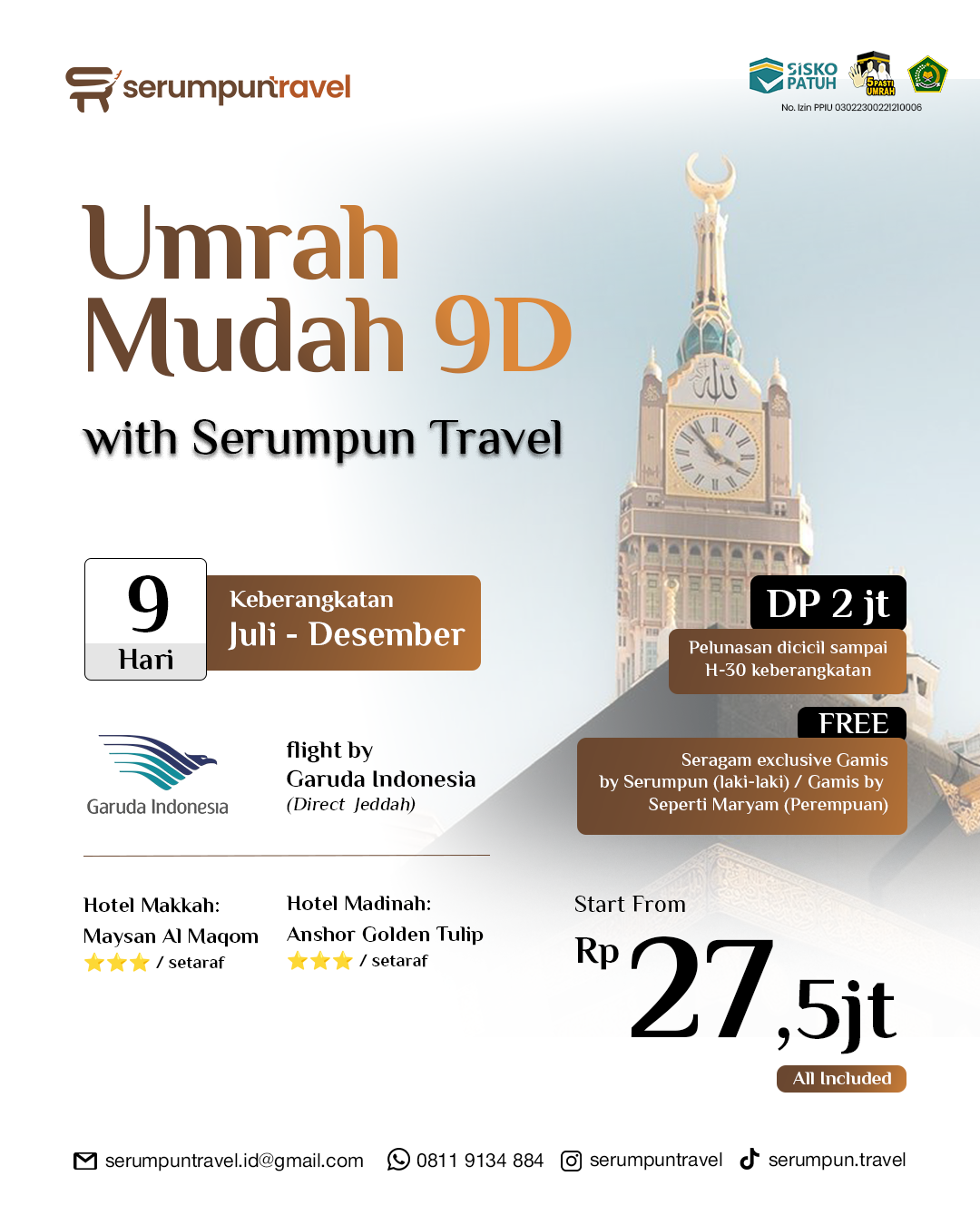 Cocok untuk kamu yang lagi cari paket umrah yang aman & nyaman dengan harga terjangkau. Yuk, berangkat bareng Serumpun Travel lewat program Umrah Mudah 9 Hari!