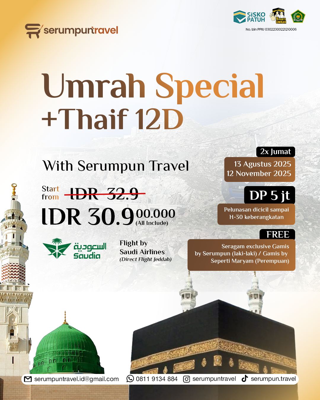 Buat kamu yang ingin merasakan langsung jejak perjalanan Rasulullah di Kota Thaif, recommended banget untuk ambil paket Umrah Special ini, karena Serumpun Travel akan layani kamu dengan pelayanan full service bintang 5.